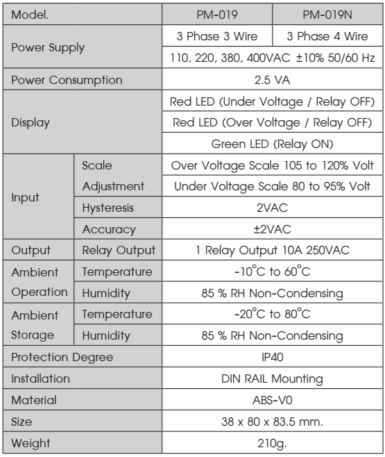 • In case model PM-019N (3-phase, 4-wire) if the neutron is missing. Relay will not work.
