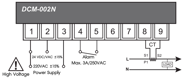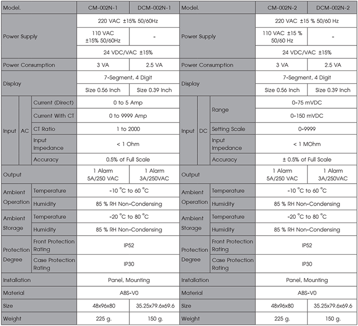 CM – 002N / DCM – 002N Is a device to measure and display alternating current (AC ) values, which can be connected with CT measurement area 0-9999 A and can be directly connected to O – 5 A. For DC current models can be connected to R-Shunt to measure current in the system with a measurement area ofO-75 mVor 0-150 mVtochoose in the same In addition, the program can scale, the input and display area, such as Input O – 75 mV can be programmed to receive O -150 mV input and display the value from O – 9999. There is a Alarm 1 Alarm Relay Output with 4 Function in setting for Load editing as needed