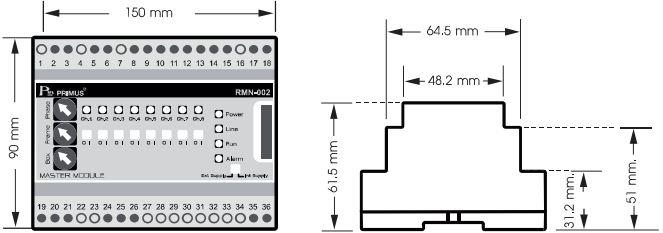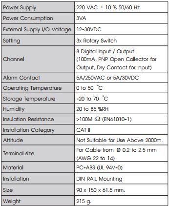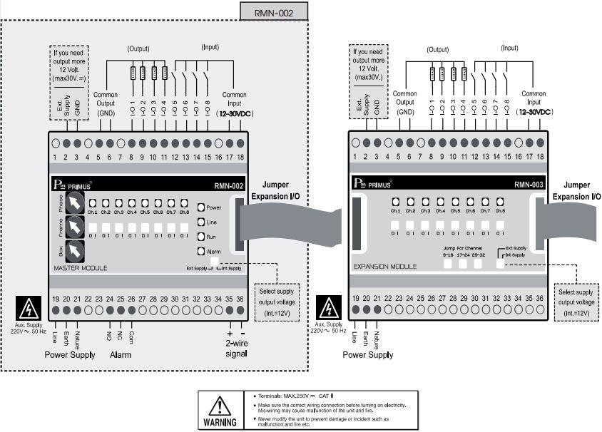 RMN-002 is the Master Module that will be the connector between digital input and output from outside and the remote control system through 2 Wire system. Master Module will have 8 channele of digital input and output and can be connected together with Expansion Input/Output Module as highest at 32 channels. The Alarm channel displays on LED in case 2 Wire system has problem, it needs at least two Master Modules to install on the starting point and the end.