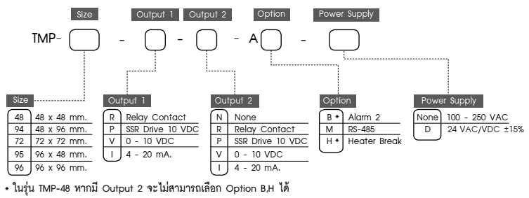 The TMP-Series can choose from two output types: Output 1 acts as Heating and Output. 2 acts as Cooling by referencing the same setpoint for more controllable inputs such as Output. 1 Heater Control for Heating and Output 2 Fan Control For cooling exceptTMP-48 (48×48 mm.) No Output 2