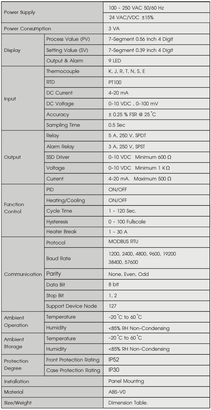 The TMP-Series is a temperature and process controller that universal input Thermocouple, PT100, 4-20 mA and 0- 10YDC inputs. Thermocouple and PTlOOcan select Type K,J, R, T, N, S, PT100 and 0-100 mY by pressing the keypad switch can control the whole system is Heating is output ON when the value is lower than Set point or Cooling system is output ON when the measured value is higher than setpoint. Both the ON/ OFF, P, PD and PIO. TheTMP -Series can manually find the PIO by pressing the button. Auto Tuning The system automatically learns the system and PID settings, thus ensuring system stability. In addition, the ON / OFF control can also set the Hysterisis to 0-100% Full Scale. To set the ON and OFF values